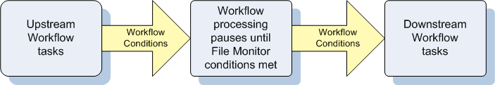In this scenario, the task launches when the upstream workflow conditions are satisfied. Workflow processing then pauses until the conditions in the Agent File Monitor task are satisfied. If the Agent File Monitor is watching for the creation, change, or deletion of a file, the task goes to SUCCESS when the event occurs. If the Agent File Monitor is watching for the existence or non-existence of a file, the task immediately goes to SUCCESS or FAILURE. Subsequent processing depends on the conditions built into the Workflow.