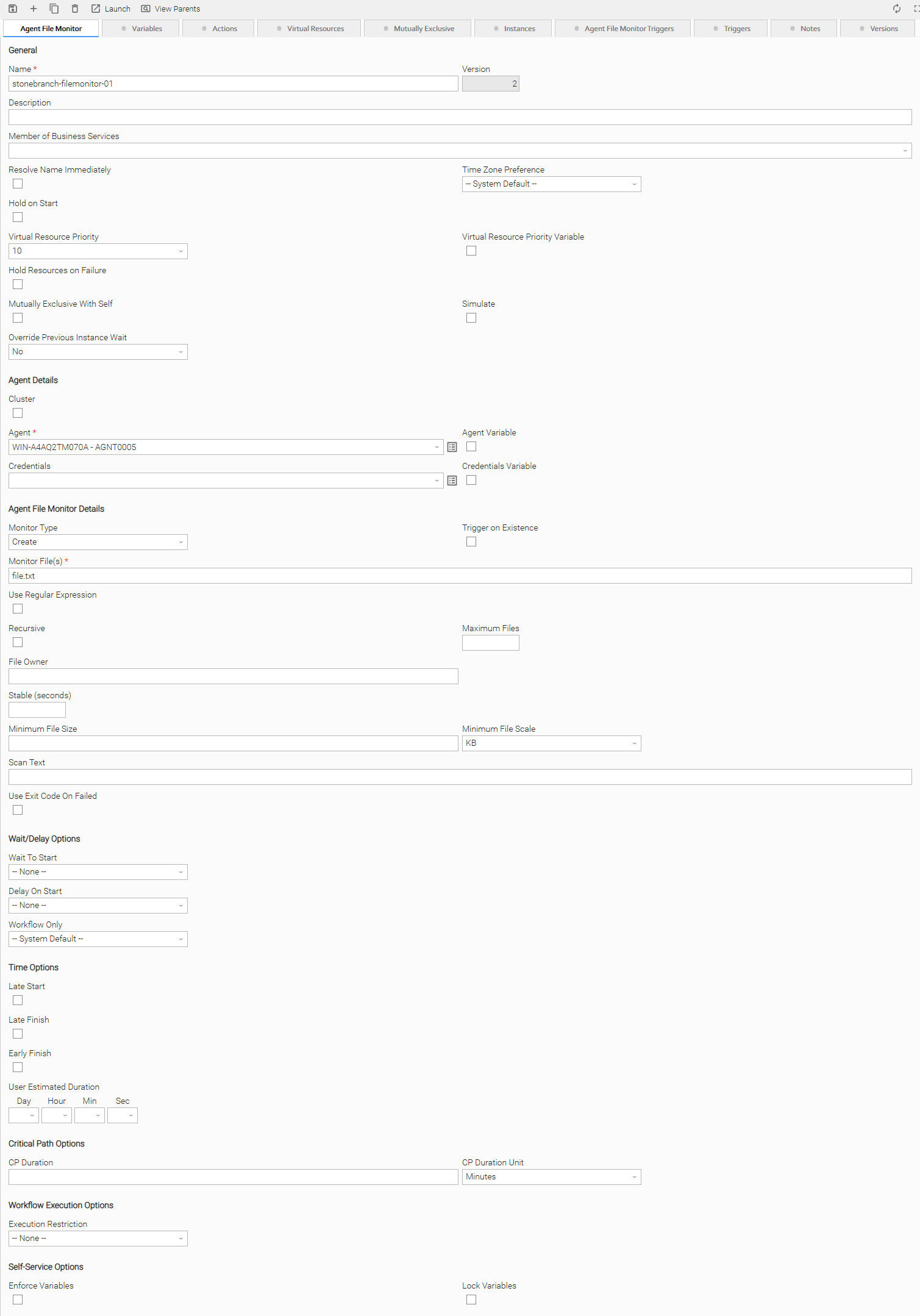 Depending on the values that you enter / select for these fields, and whether or not the Agent File Monitor task has ever been launched, more (or less) fields may display. See the field descriptions, below, for a description of all fields that may display in the Agent File Monitor Task Details.