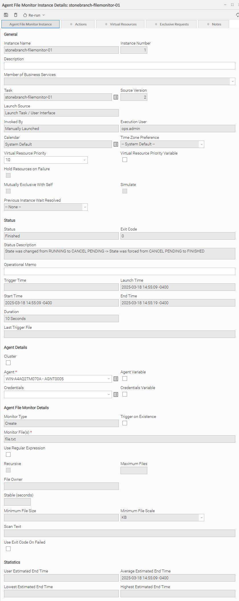 The following Agent File Monitor Task Instance Details contains information on the execution of the task shown in the Agent File Monitor Task Details.