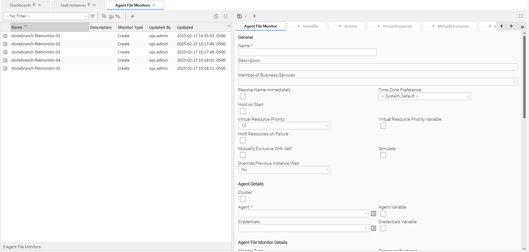 - Instances tab on the Agent File Monitor Task Details for that task