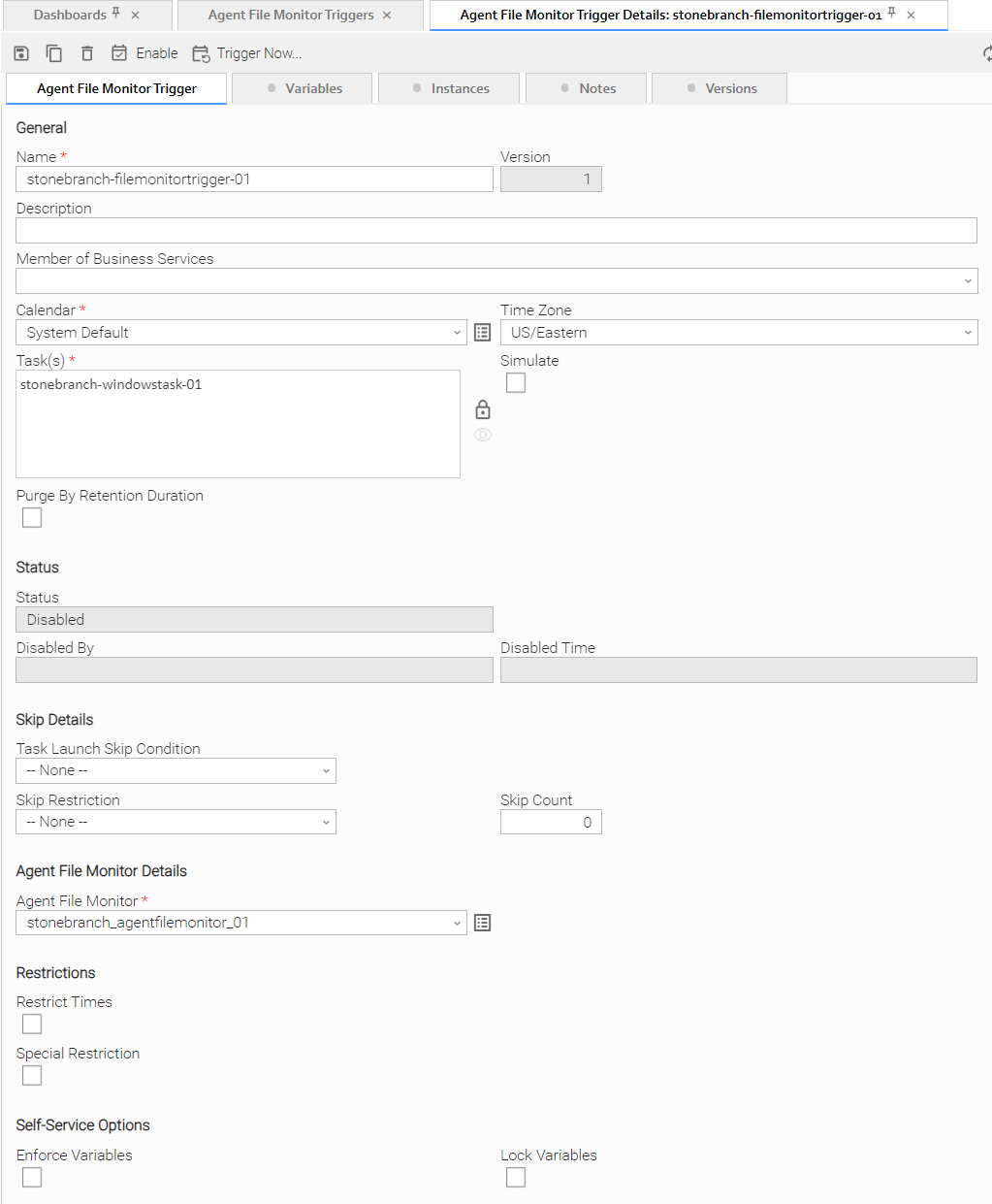 Status | System-defined; Specification for whether the trigger is Enabled or Disabled. The user enables and disables the trigger by clicking the Enable / Disable buttons. Only enabled triggers are processed by the Controller. |
