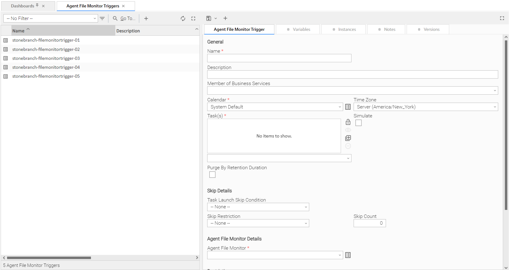 Step 1 | From the Automation Center navigation pane, select Triggers > Agent File Monitor Triggers. The Agent File Monitor Triggers list displays. To the right of the list, Agent File Monitor Trigger Details for a new Agent File Monitor trigger displays.
