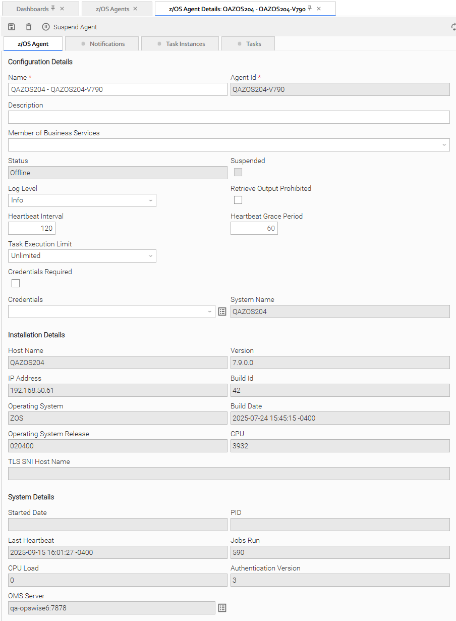 • To suspend an Agent from the Agent Details, click the Suspend Agent button. A Resume Agent button replaces the Suspend Agent button.