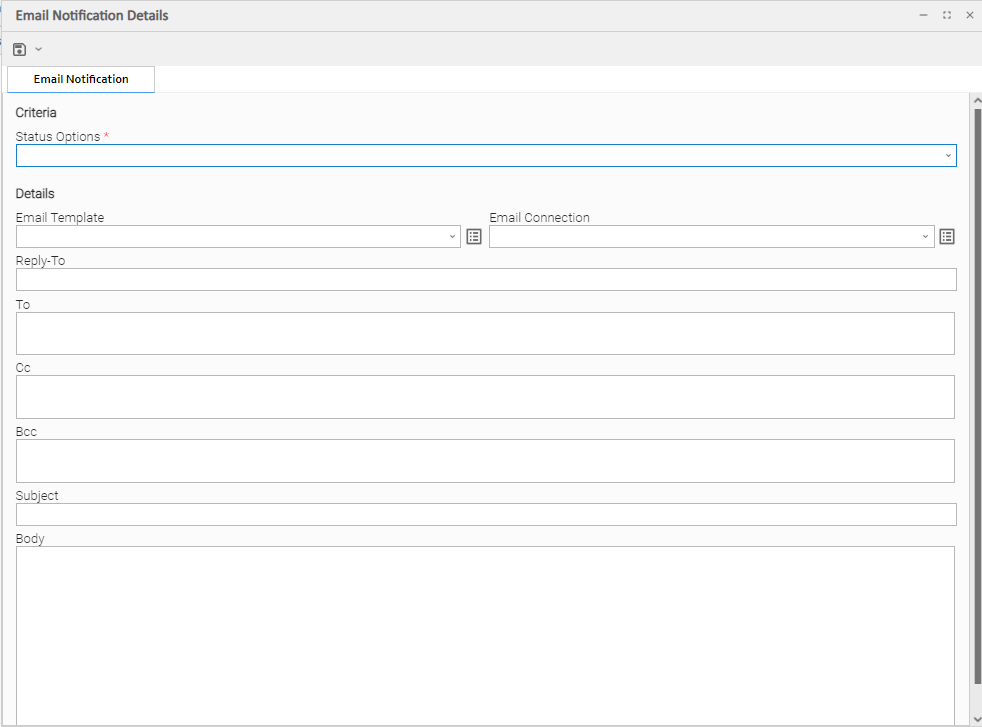 Required if an Email Template is not specified in the Email Template field; Name of an outgoing Email Connection (Type = Outgoing). An Email Connection specifies information about an outgoing or incoming email server. Enter the name of an existing outgoing Email Connection, select an existing outgoing Email Connection from the drop-down list, or clear the Email Connection field and click the Details icon to create a new Email Connection (Outgoing will be pre-selected in the Type field).