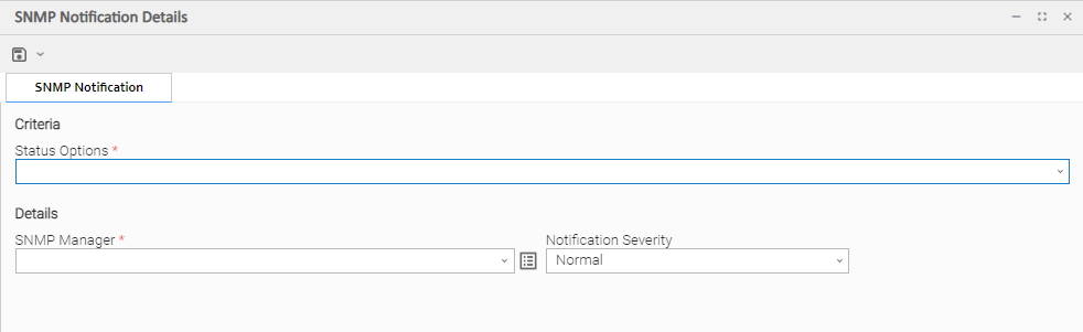 The SNMP Manager that will receive the SNMP notification. Enter the name of an existing SNMP Manager, select an existing SNMP Manager from the drop-down list, or clear the SNMP Manager field and click the Details icon to create a new SNMP Manager.