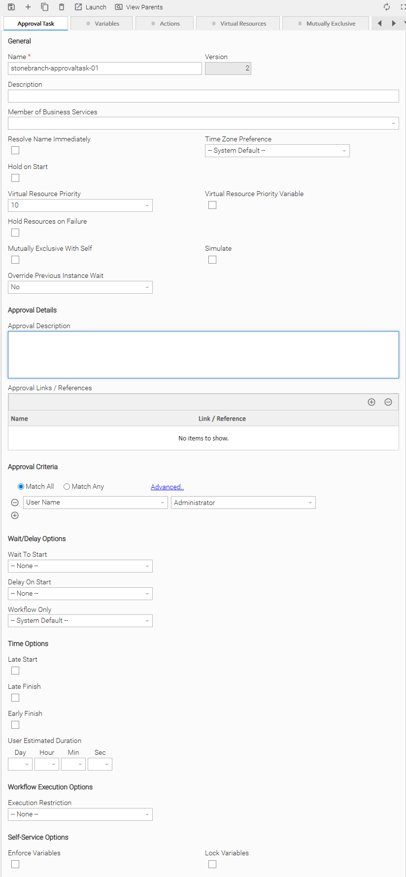 Depending on the values that you enter / select for these fields, and whether or not the Approval task has ever been launched, more (or less) fields may display. See the field descriptions, below, for a description of all fields that may display in the Approval Task Details.