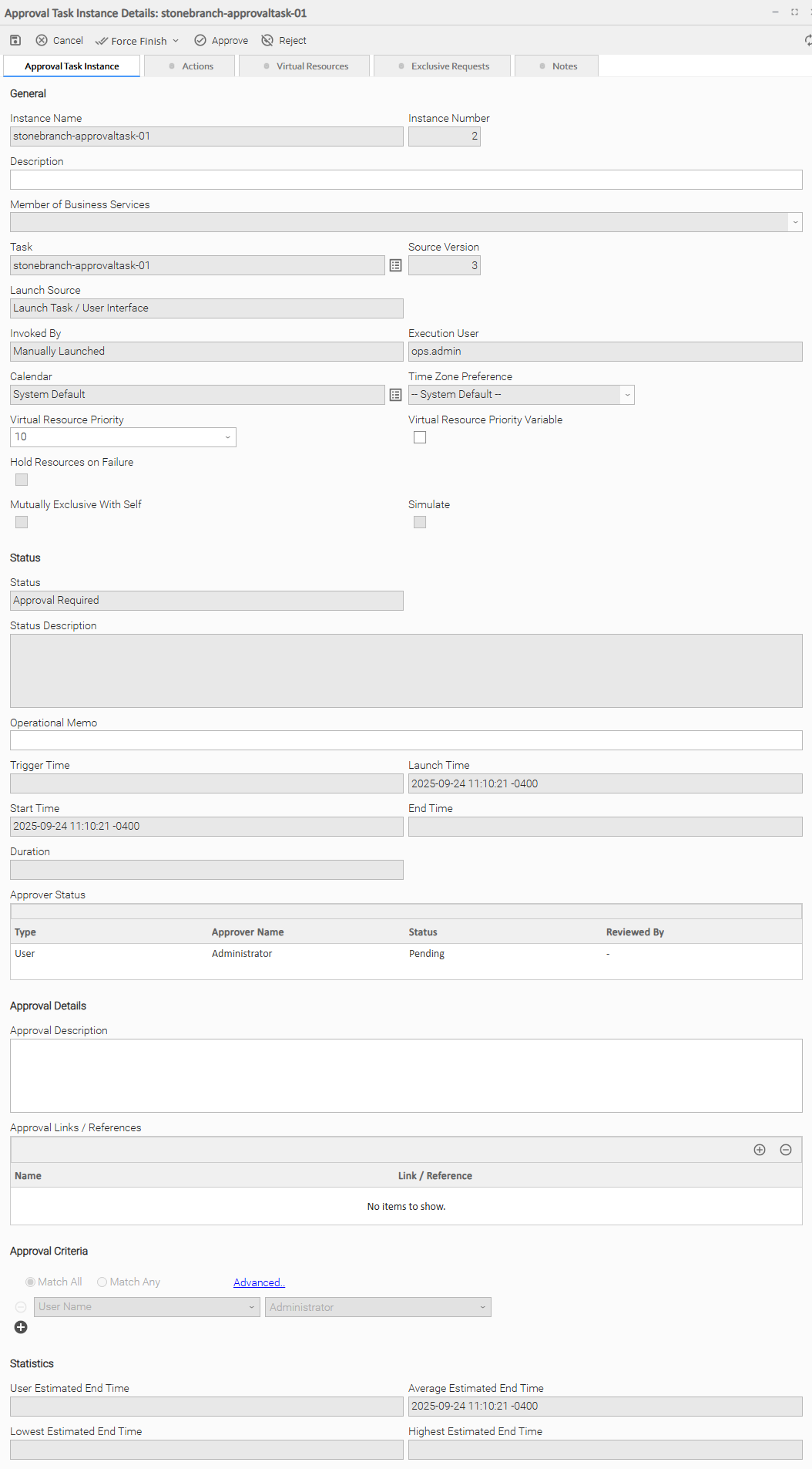 The following Approval Task Instance Details contains information on the execution of the task shown in the Approval Task Details.
