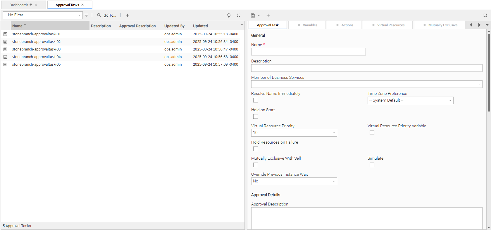 Step 1 | From the Automation Center navigation pane, select Tasks > Approval Tasks. The Approval Tasks list displays a list of all currently defined Approval tasks. Below the list, Approval Task Details for a new Approval task displays.