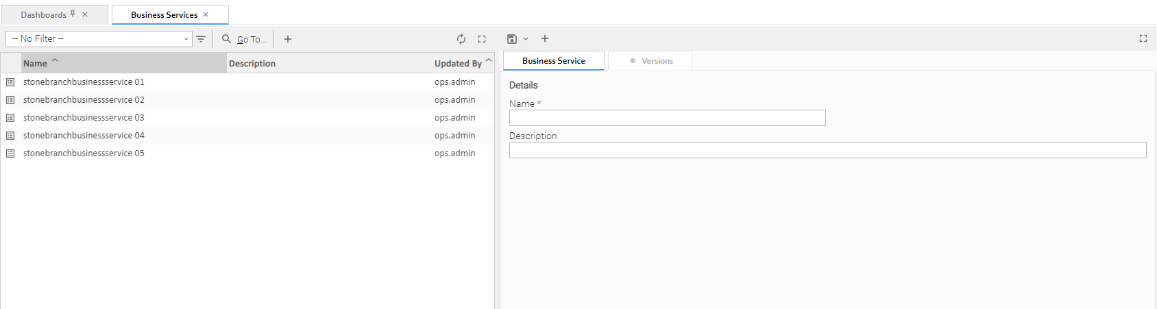 For information on how to access additional details - such as Metadata and complete database Details - for Business Services (or any type of record), see Records.