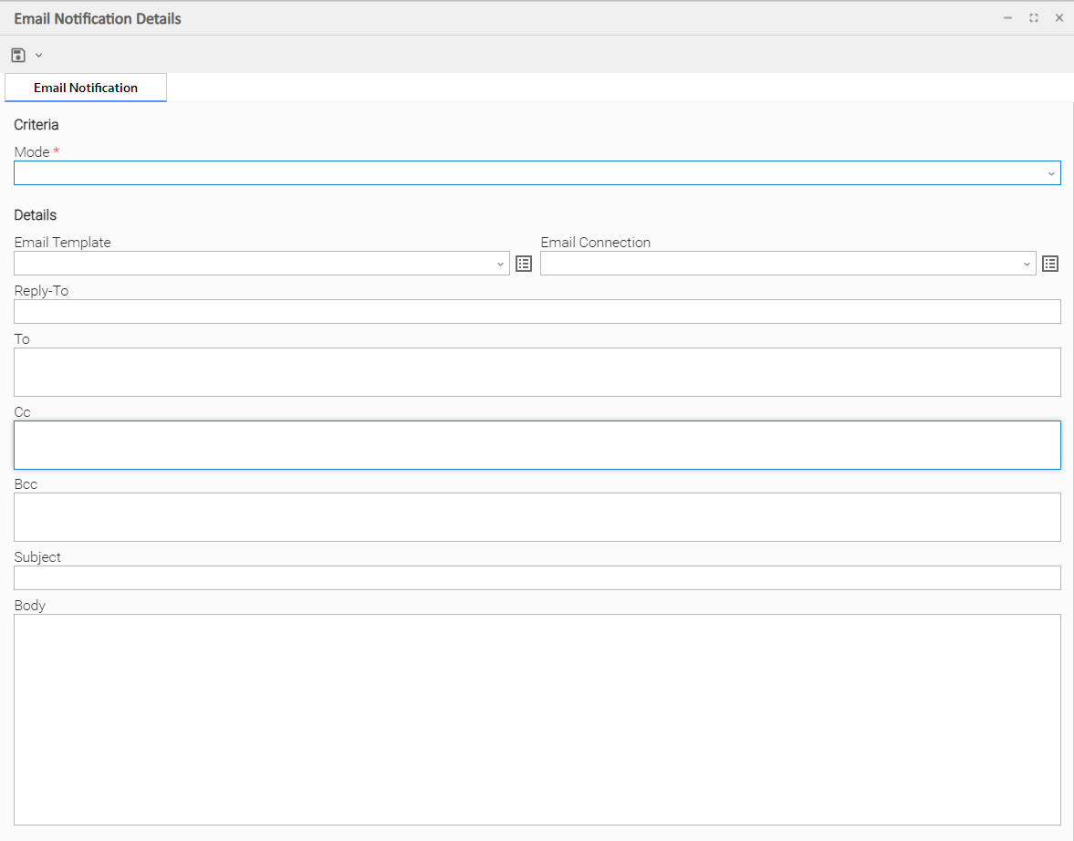 Email Connection | Required if an Email Template is not specified in the Email Template field; Name of an outgoing Email Connection (Type = Outgoing). An Email Connection specifies information about an outgoing or incoming email server. Enter the name of an existing outgoing Email Connection, select an existing outgoing Email Connection from the drop-down list, or clear the Email Connection field and click the Details icon to create a new Email Connection (Outgoing will be pre-selected in the Type field). If you specify both an Email Template and an Email Connection (in this field), the Email Connection specified in this field overrides the Email Connection specified in the Email Template field. |