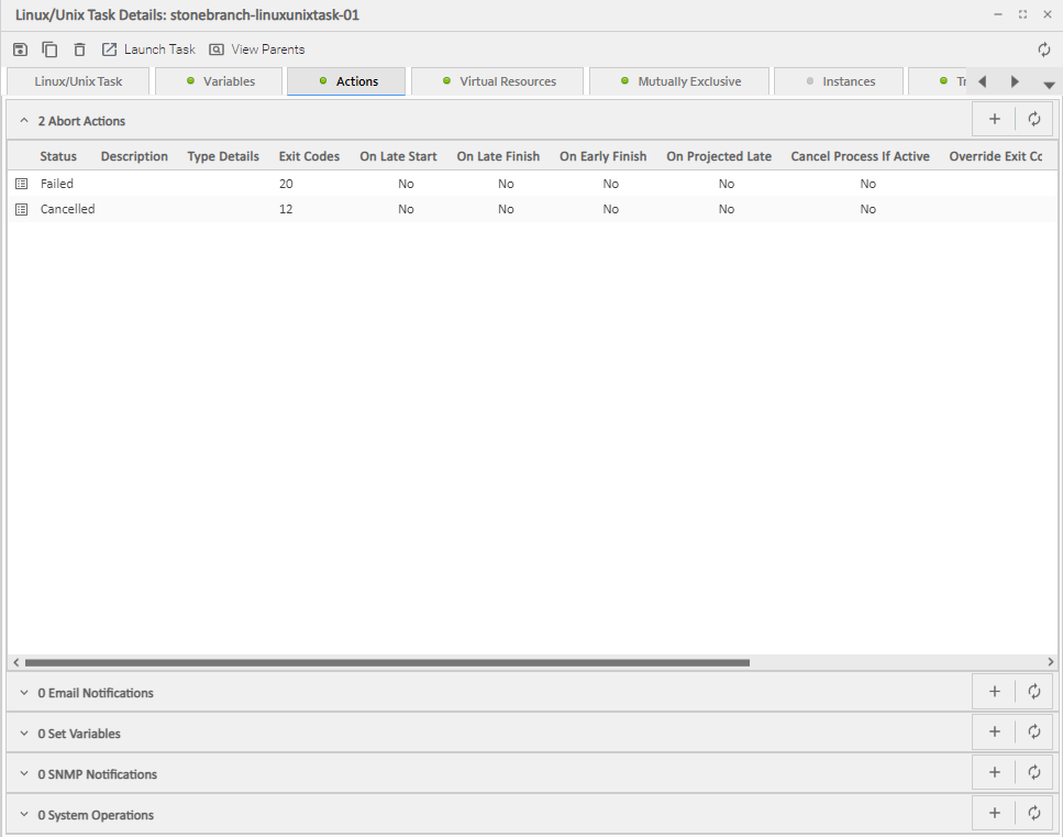 Click the Actions tab. A list of any defined Actions for that task displays.