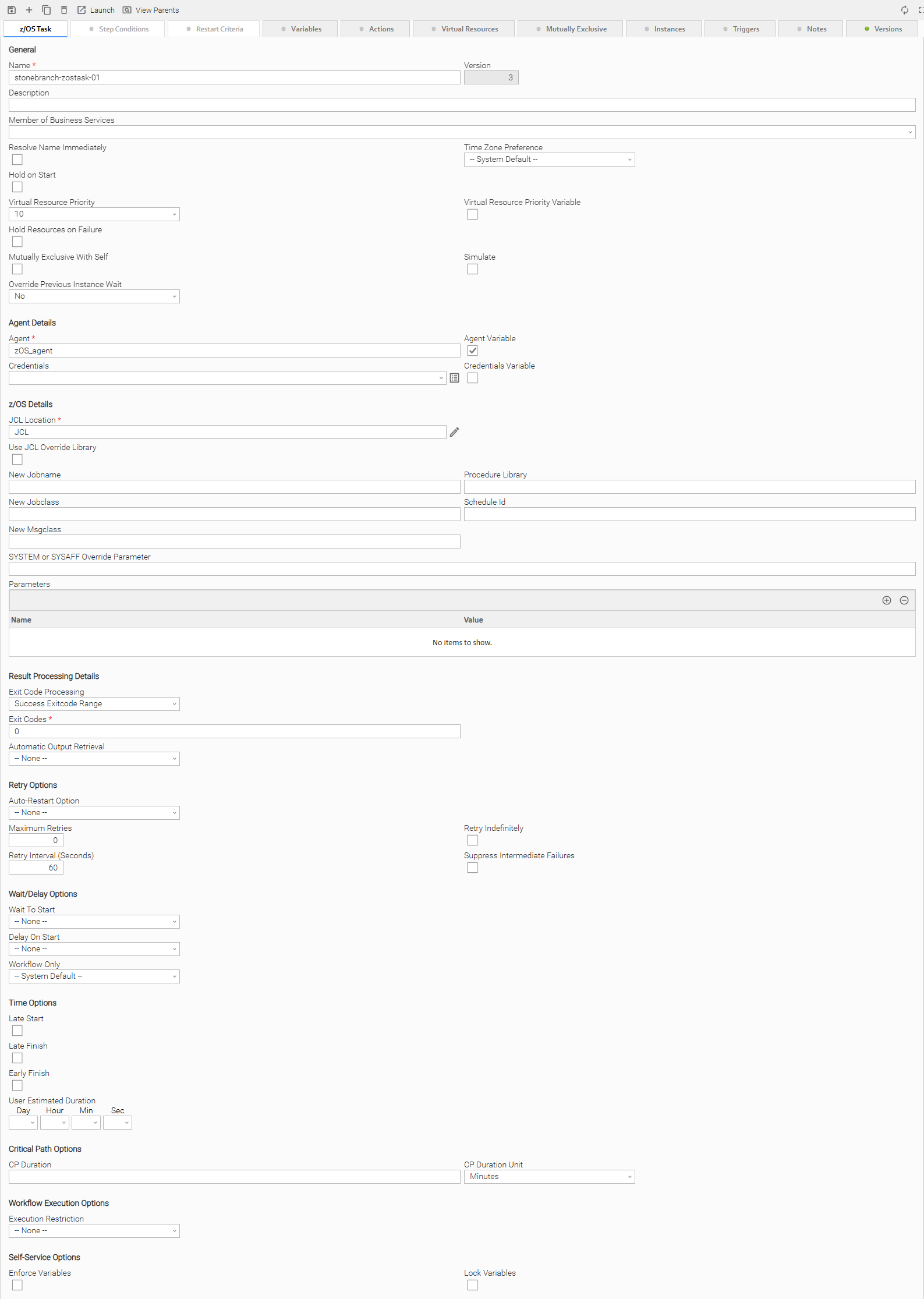 Depending on the values that you enter / select for these fields, and whether or not the z/OS task has ever been launched, more (or less) fields may display. See the field descriptions, below, for a description of all fields that may display in the z/OS Task Details.