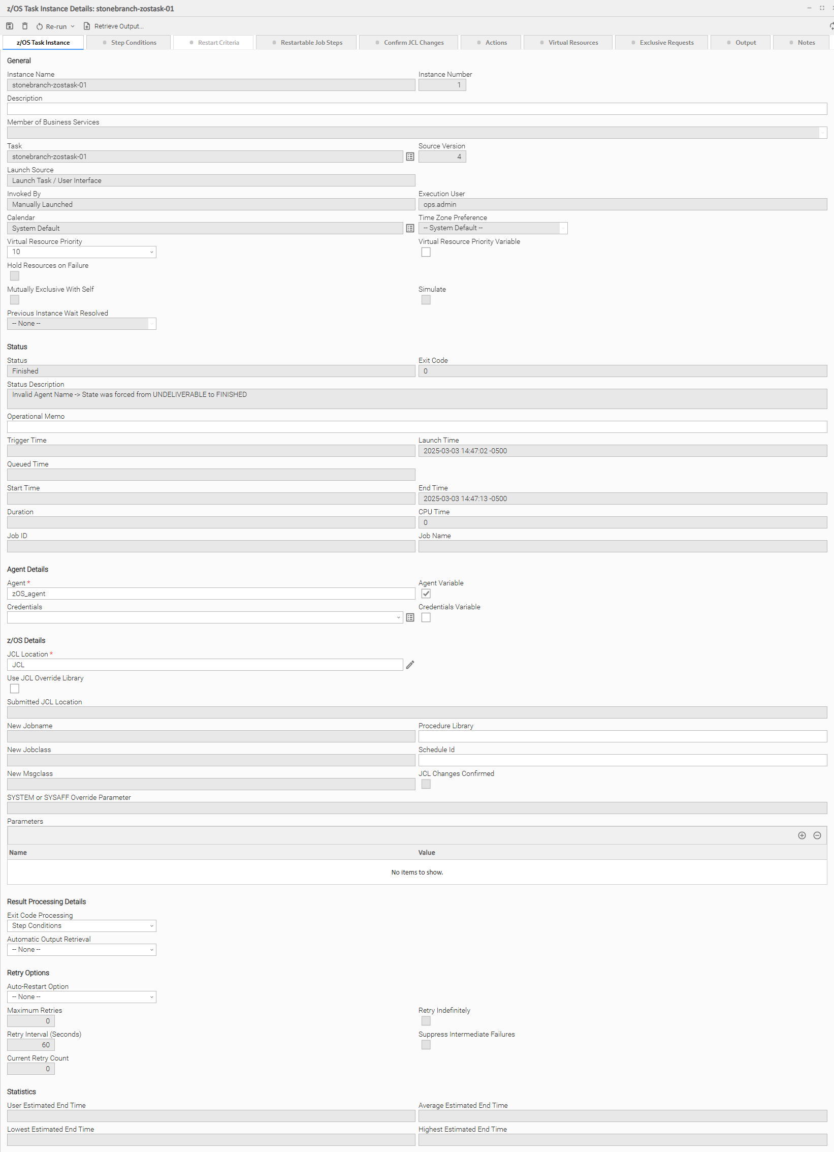 The following z/OS Task Details is for an existing z/OS task.