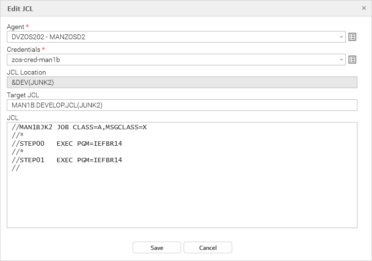Select the Agent and Credentials for the JCL Location and click View. The Edit JCL pop-up dialogue displays.