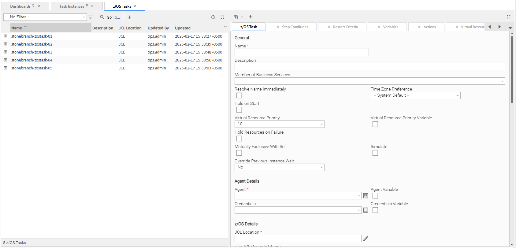 To the right of the list, z/OS Task Details for a new z/OS task displays.