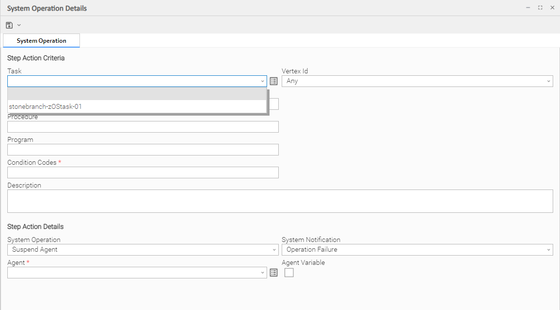 Every z/OS task is comprised of one or more steps. Each step in a z/OS task ends in a step condition code. System Operation step actions optionally let you send system notifications based on the outcome of each step action with options for None, Operation Failure, Operation Success/Failure, and Operation Success.