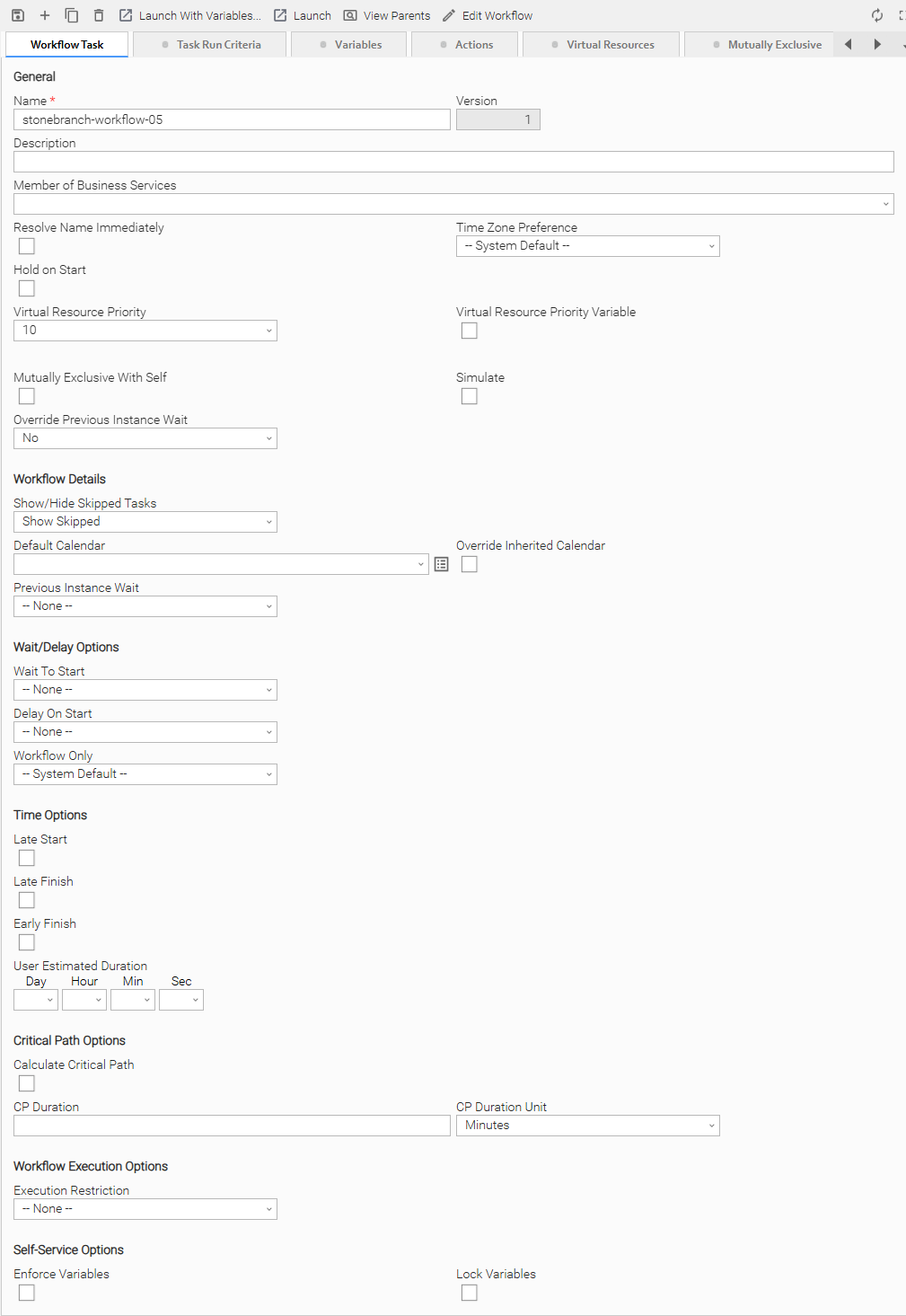 Workflow Instance Name Ends With | If Workflow Instance Name Condition = Ends With; Character string at the end of the name of a parent workflow task instance containing the task. Variables are supported. |