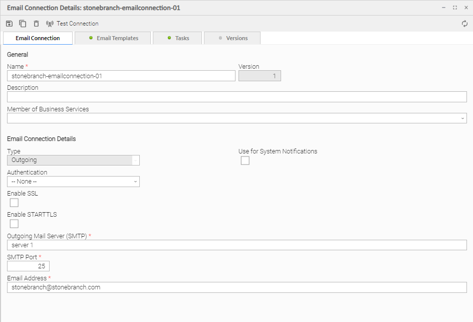 Email Address | If Type is Outgoing; Email address of the sender. warning If the selected sender email address is invalid, or becomes invalid at any time after you create an Email Connection, all Email Notifications that specify that Email Connection will fail, but no warning will be issued. You must click the Test Connection button to test the Email Connection, which will generate an error message in the Console. |
