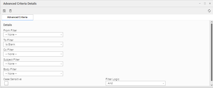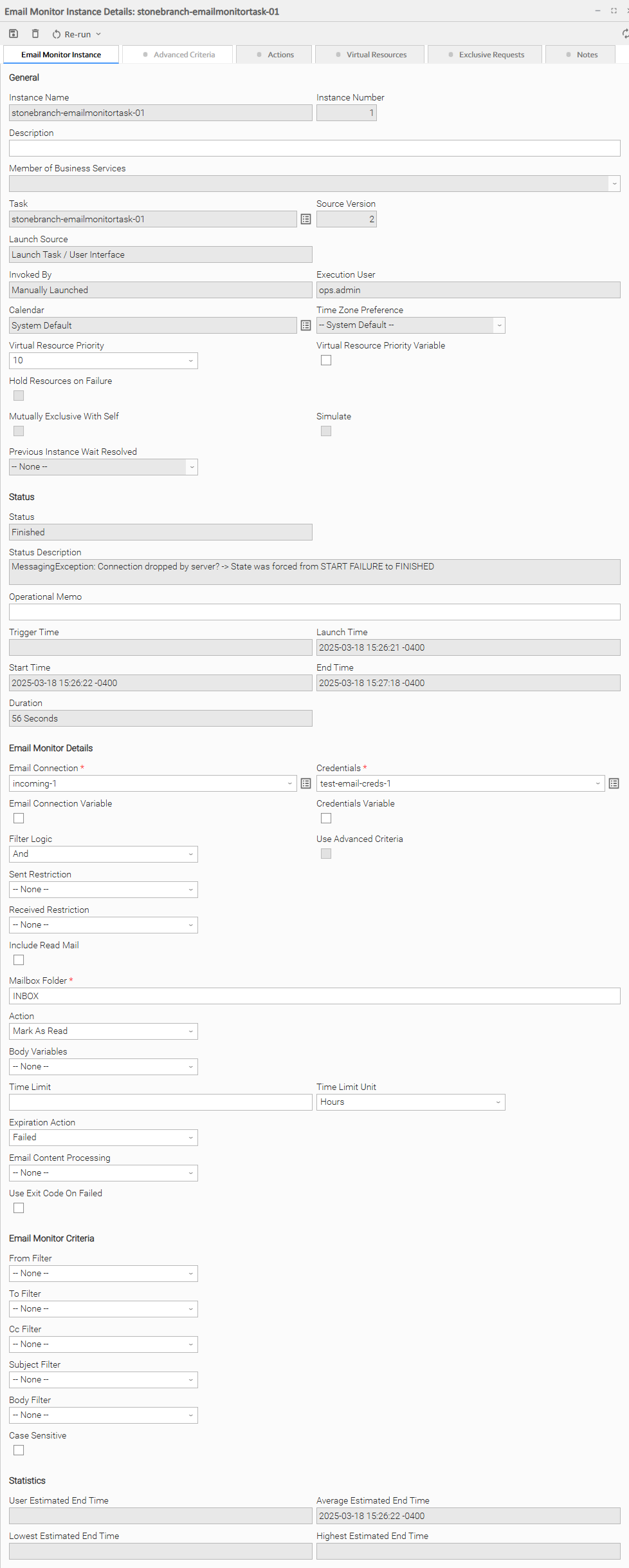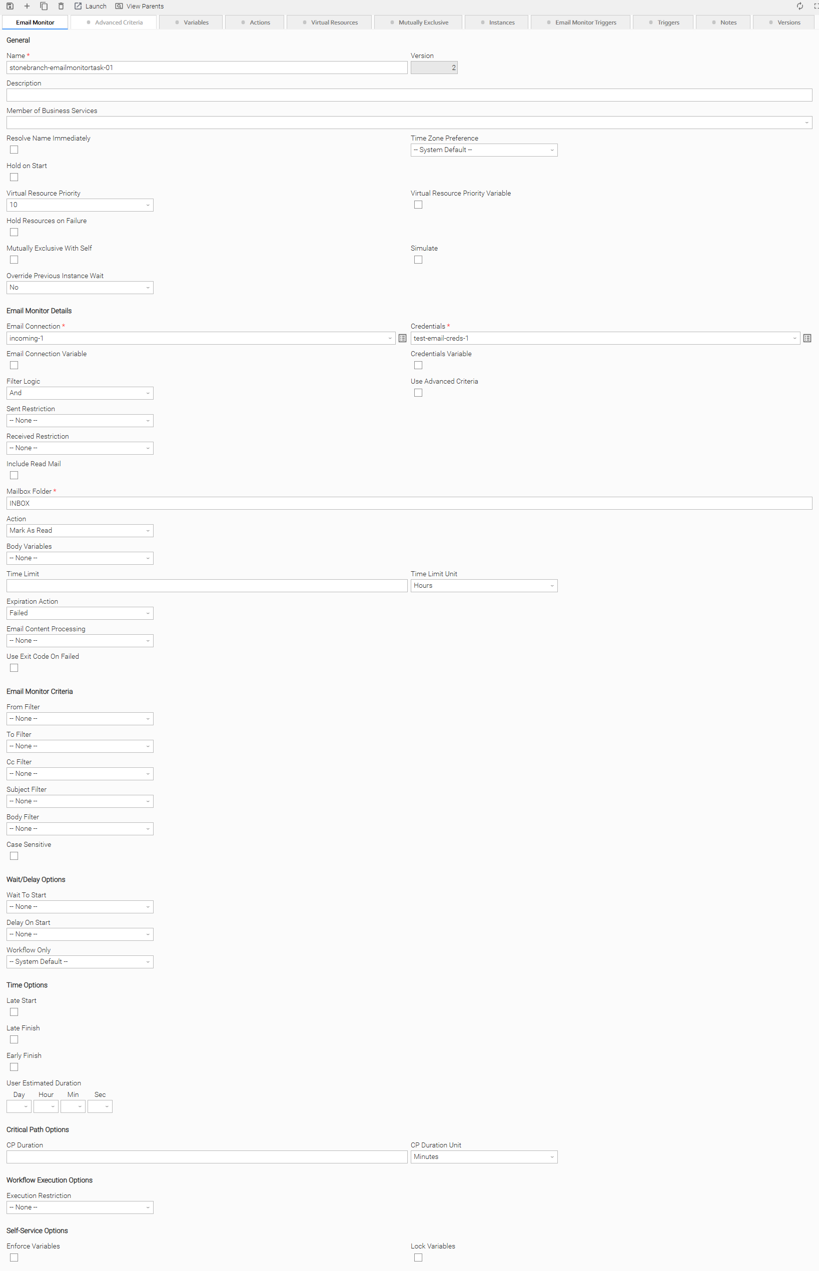 Depending on the values that you enter / select for these fields, and whether or not the Email Monitor task has ever been launched, more (or less) fields may display. See the field descriptions, below, for a description of all fields that may display in the Email Monitor Task Details.