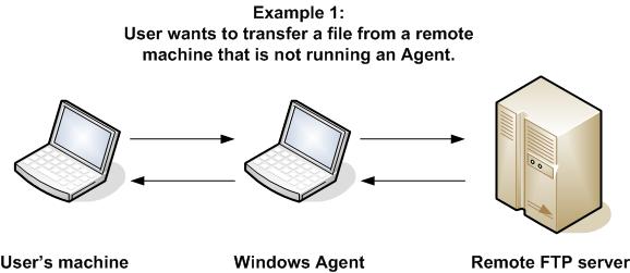 In the first example, the user wants to transfer a file from a remote File Transfer Server on a machine that does not have an Agent running on it. In this case, the File Transfer task definition provides an address and login credentials for the machine where the Agent is running as well as address and login credentials for the machine where the File Transfer server is running.