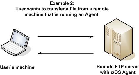 In the second example, the user wants to transfer a file from a remote File Transfer Server on a z/OS machine that does have an Agent running on it. In this case, the login credentials for the Agent machine and the File Transfer server machine are the same.