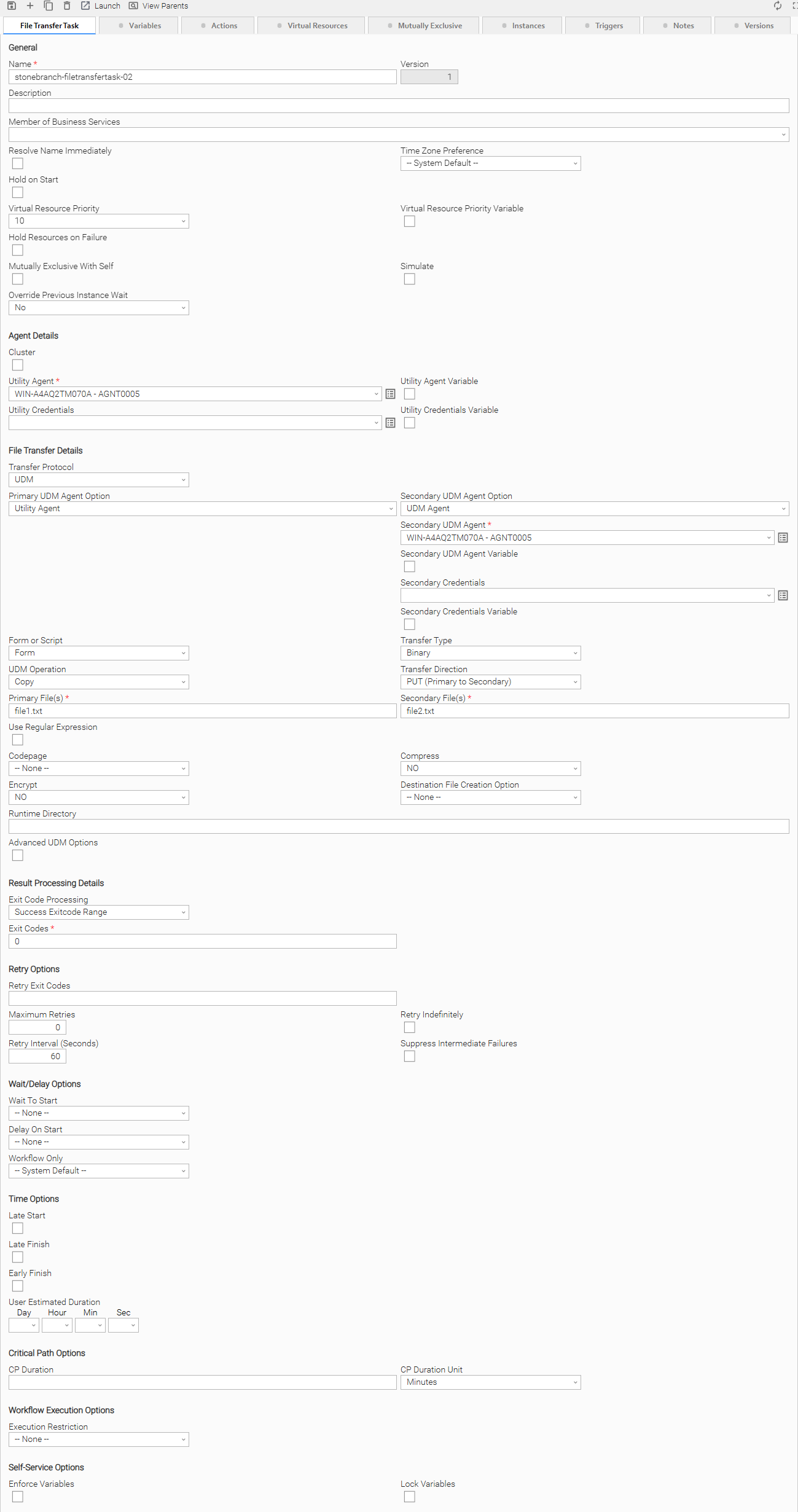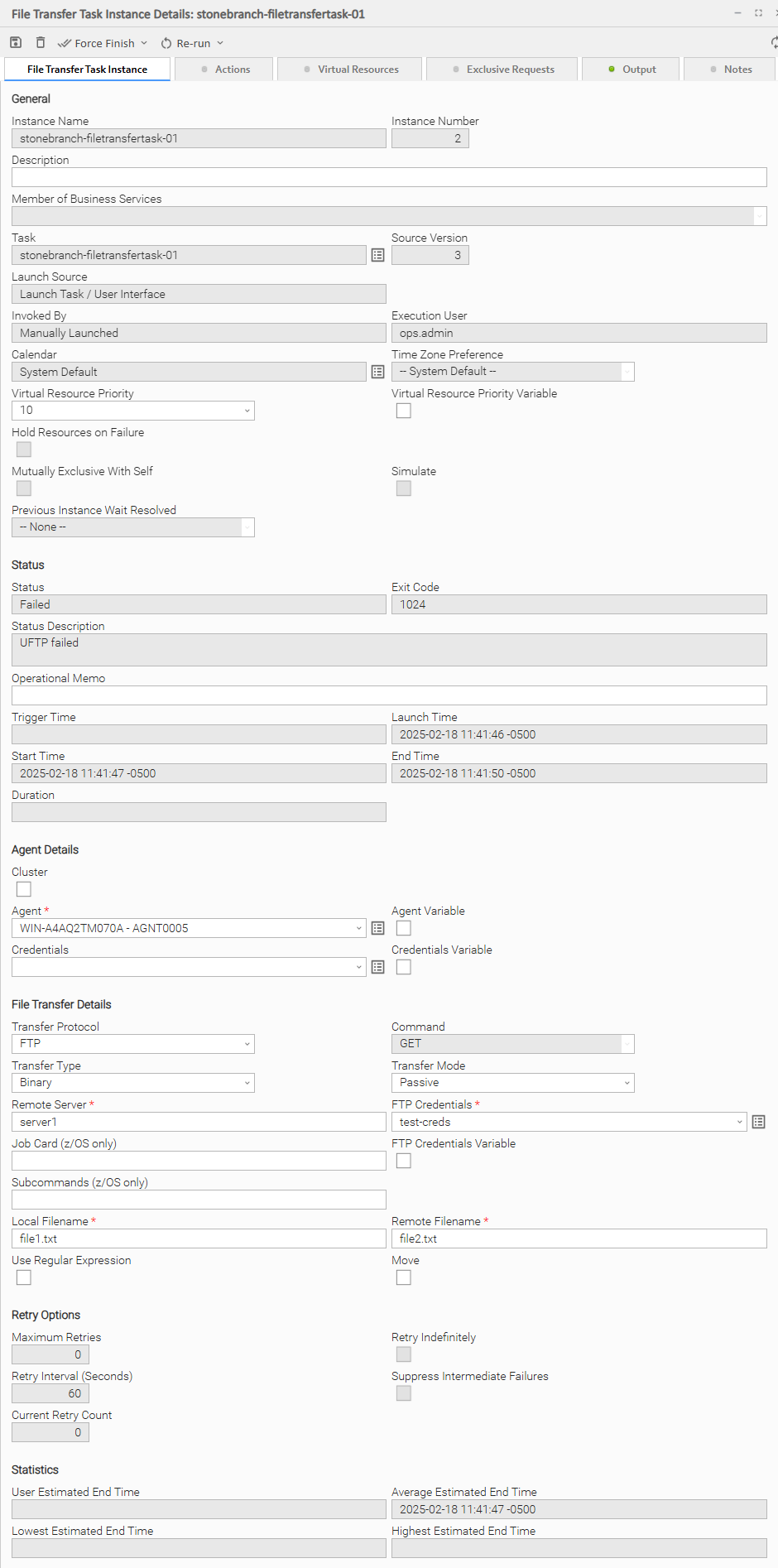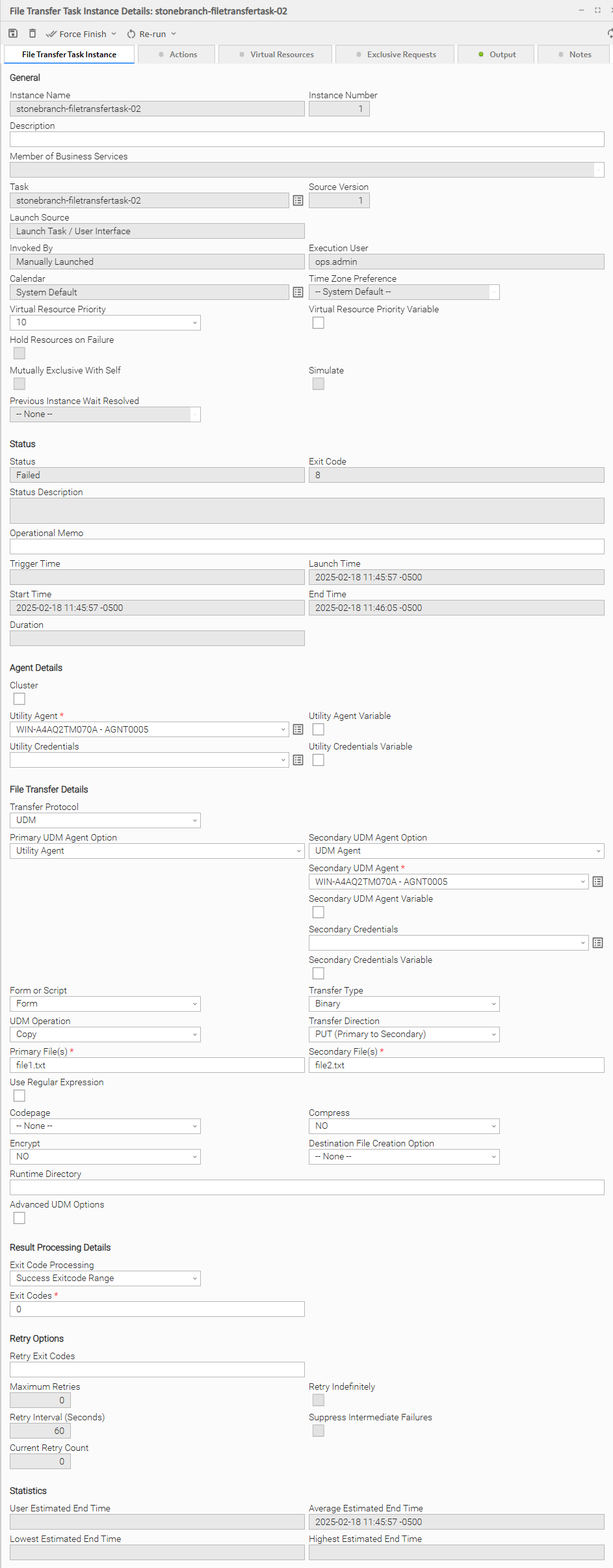 The following UDM File Transfer Task Instance Details contains information on the execution of the task shown in the UDM File Transfer Task Details.