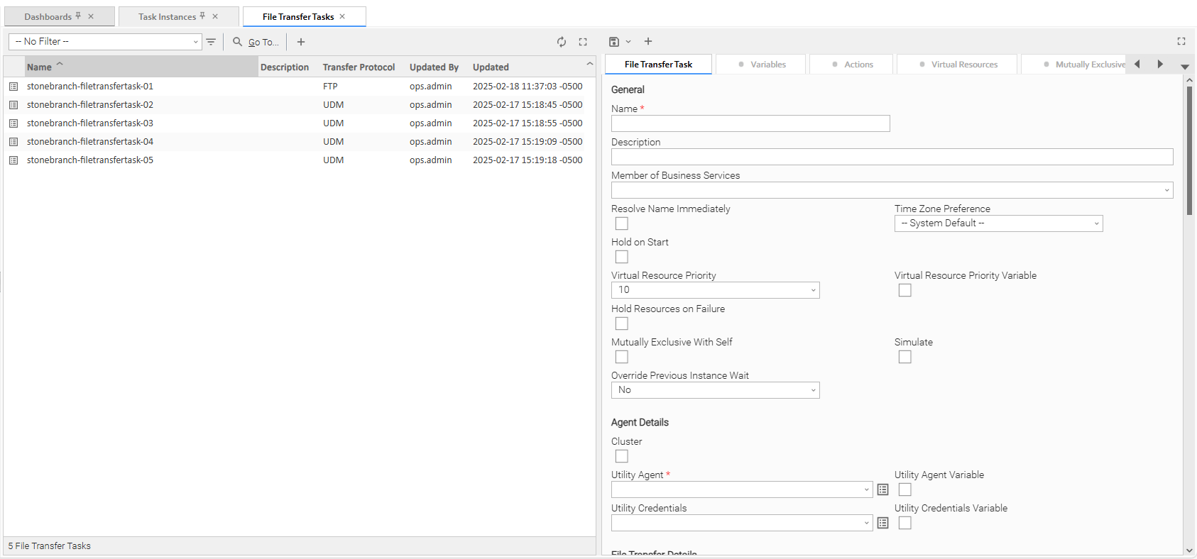 To the right of the list, File Transfer Task Details for a new File Transfer task displays.