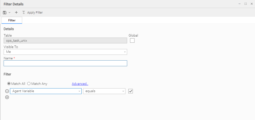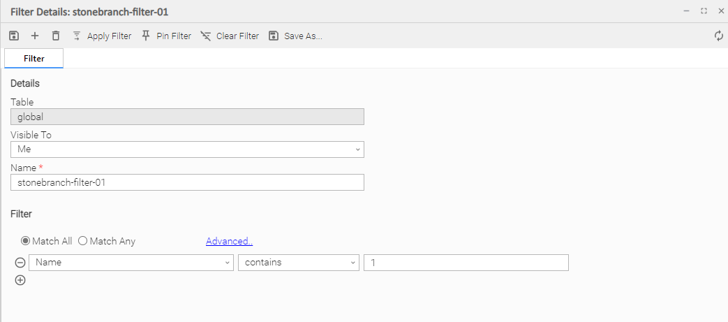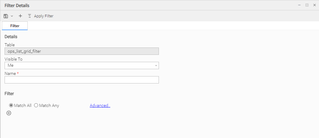 Match All | Specifies that when this Filter is applied, the list will displays all records that match all of the criteria. |