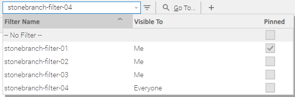 The list identifies the name of each Filter, to whom the Filter is visible, and whether or not the Filter is pinned. |