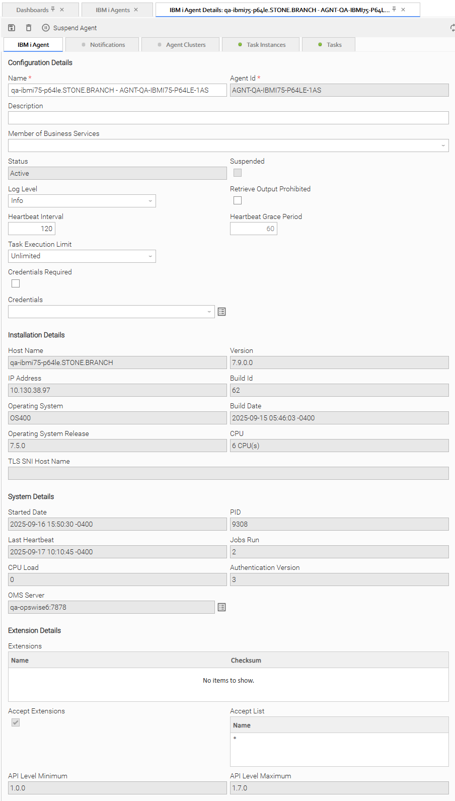 You also can choose to temporarily suspend the agent's ability to run tasks. See the field descriptions, below, for details about all fields in the IBM i Agent Details. |