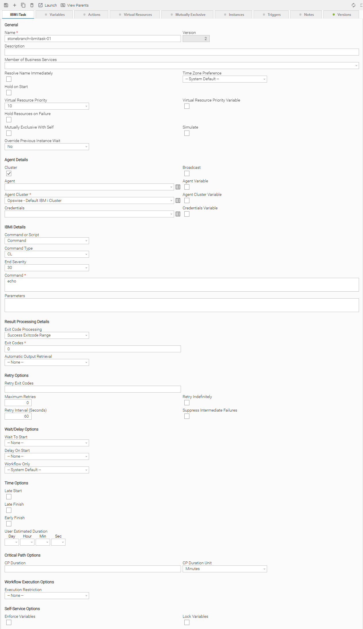 Depending on the values that you enter / select for these fields, and whether or not the IBM i task has ever been launched, more (or less) fields may display. See the field descriptions, below, for a description of all fields that may display in the IBM i Task Details.
