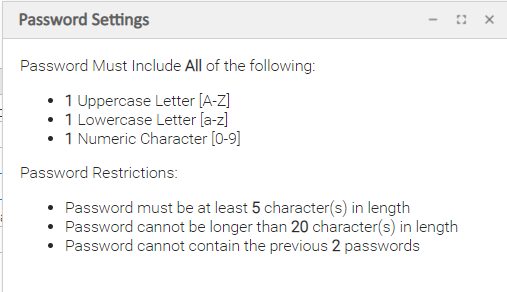 Below the Change Password button, the Change Password dialog will displays any characteristics and restrictions defined in Password Settings.