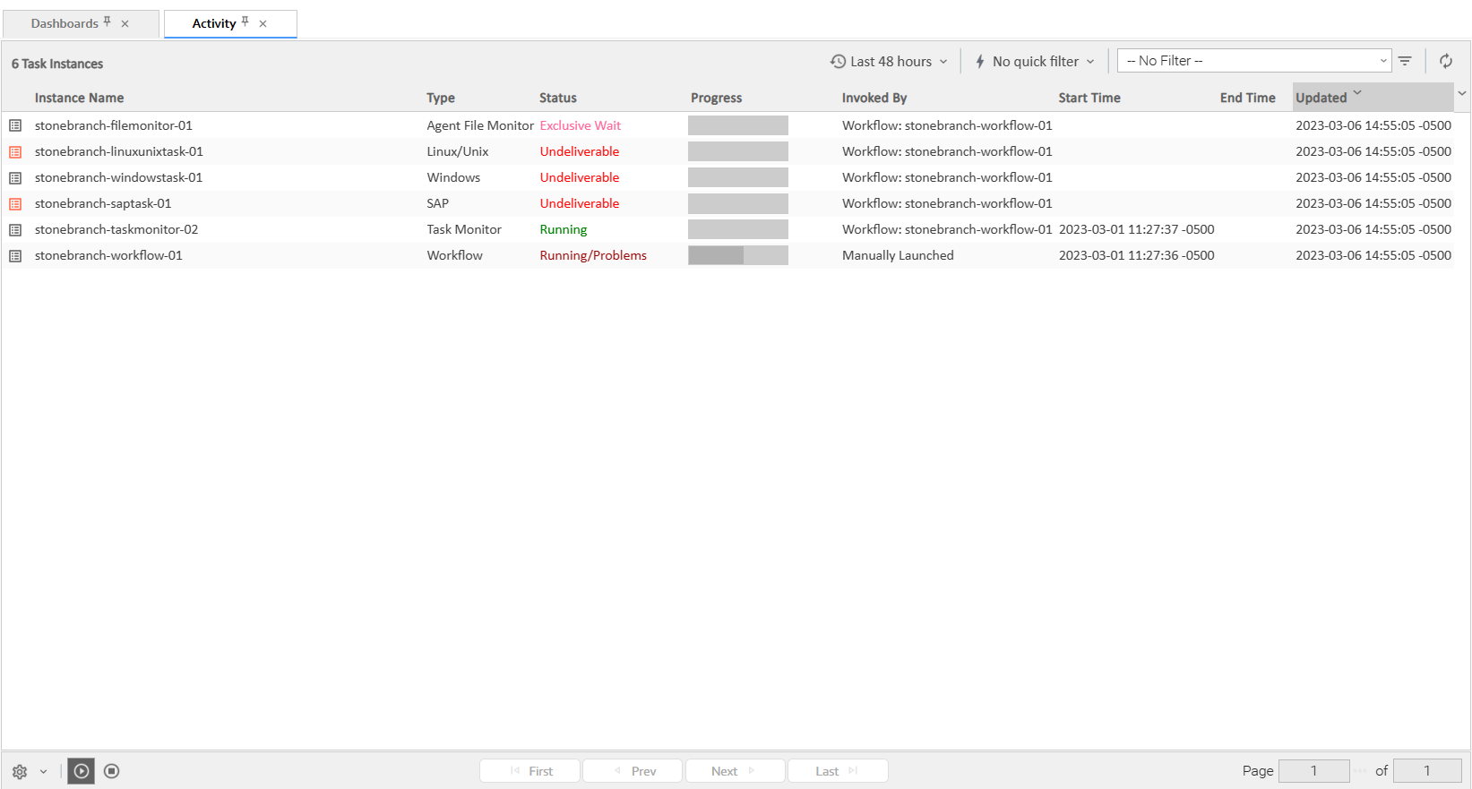 From the Automation Center navigation pane, select Task Instances > Activity. The Activity Monitor displays task status information based on the settings in the Activity Monitor Task Bar.