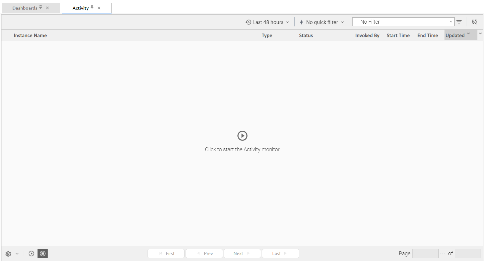Page navigation buttons allow you to scroll through the pages of task instances that are displayed according to the current Activity Monitor settings.
