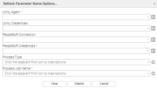 When you click the Submit button on the Refresh Parameter Name Options... dialog, the drop-down list for the Parameter Name field in the RunTime Parameter Details is populated with values that are determined by the values that you submitted on the Refresh Parameter Name Options... dialog.