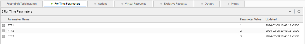 Click the Runtime Parameters tab. The Runtime Parameters list displays a list of all Runtime Parameters for which values have been defined for this task.