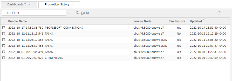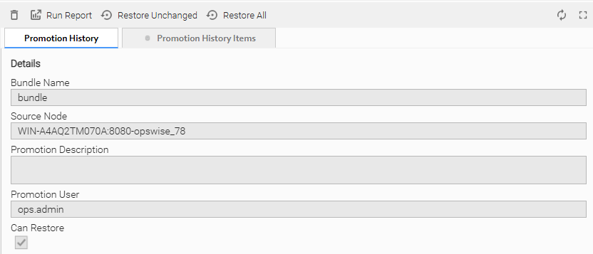 Can Restore | Specification for whether or not records in the bundle that already existed on the target server can be restored to their state prior to the promotion. info Any promoted Bundle that includes Universal Template changes cannot be restored. The Promotion History for the promotion will be flagged as not restorable. The Universal Template changes will be listed as Promotion History Items with blank New Version, Previous Version, and Source Version fields. |