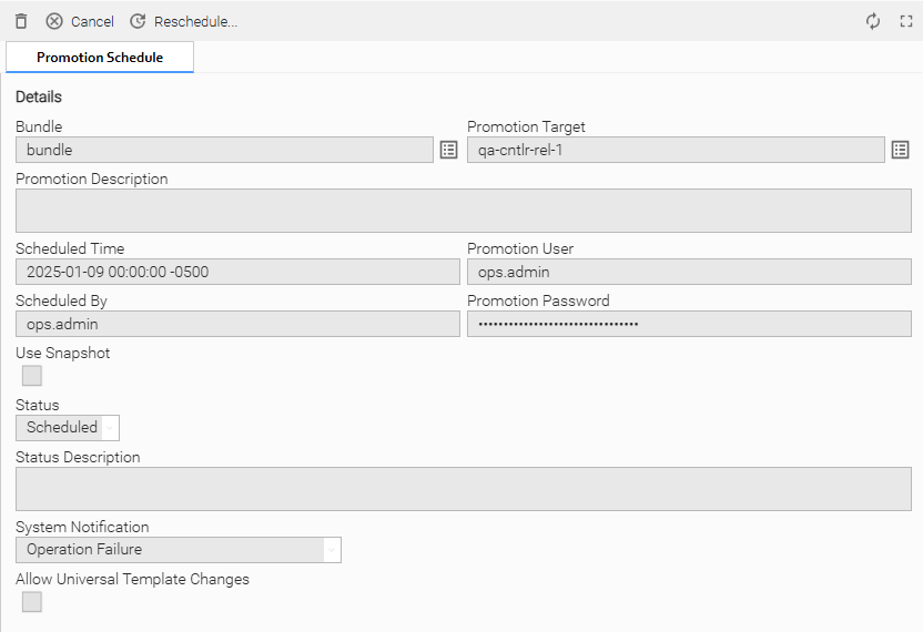 Step 3 | Click OK to confirm that you want to re-promote the selected snapshot Bundle. The Reschedule... pop-up dialog displays: