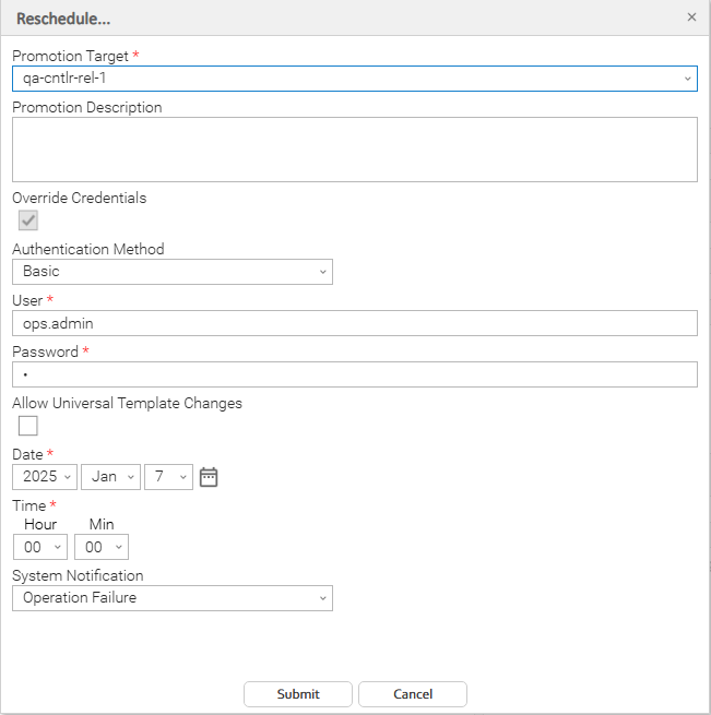 Step 5 | Click the Submit button to apply your re-scheduling changes to the Promotion Schedule. The status of the Promotion Schedule automatically changes from Promoted to Scheduled when you submit rescheduling changes. |