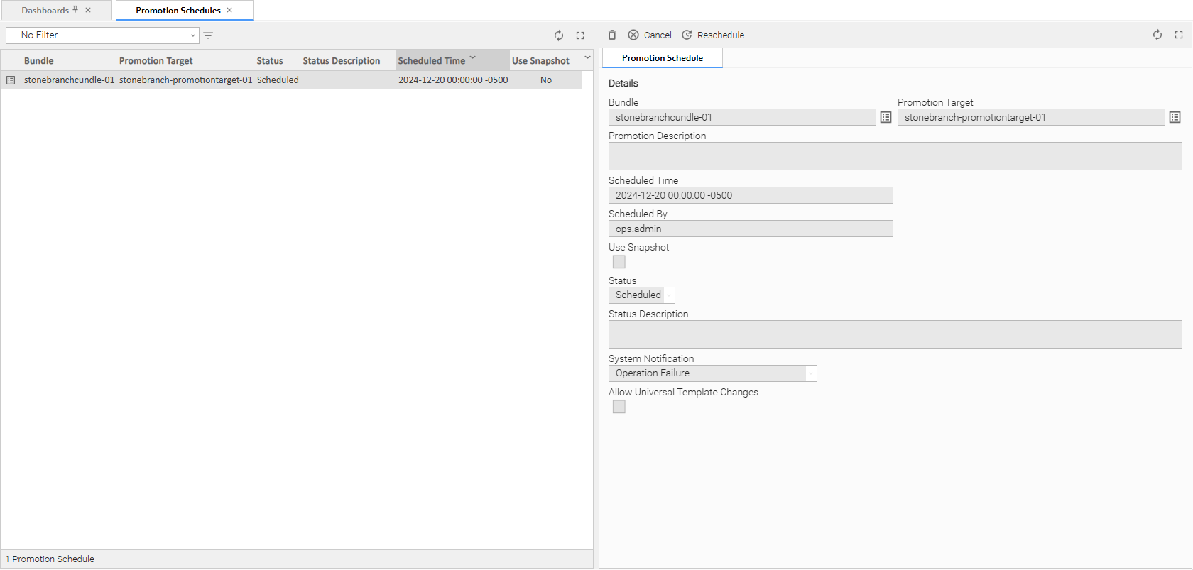 If you schedule a promotion to be run at a later time on the Promote Bundle... dialog, the Controller creates a record for that promotion.