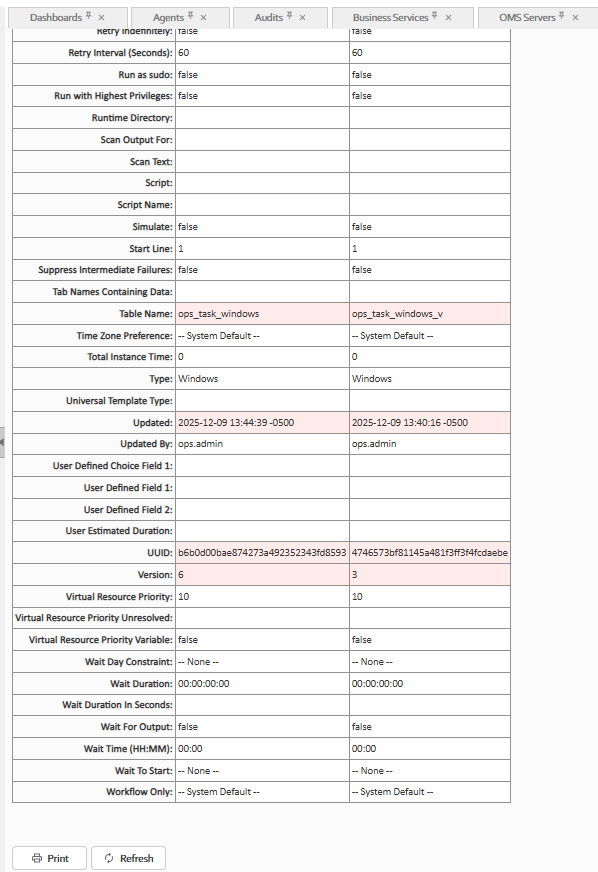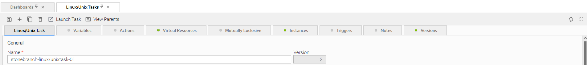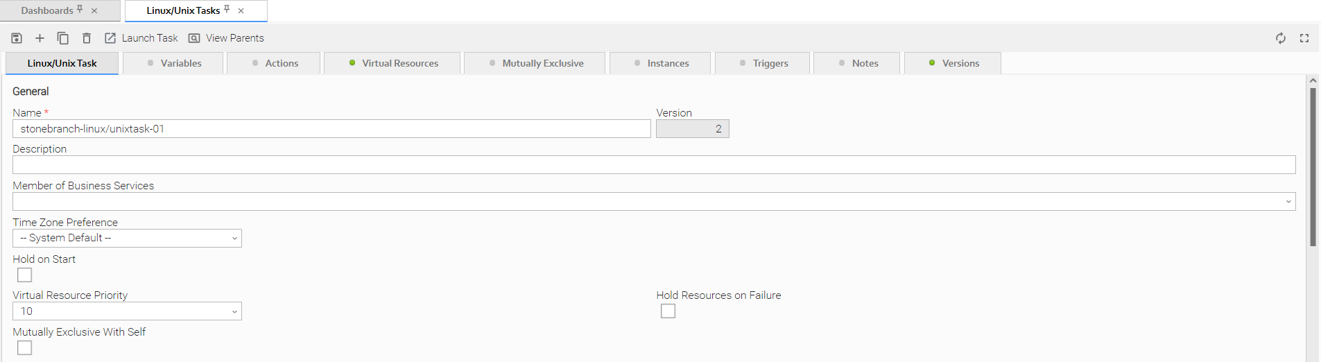 For example, this Linux/Unix Task Details shows that there are one or more records under the Virtual Resources and Versions tabs: