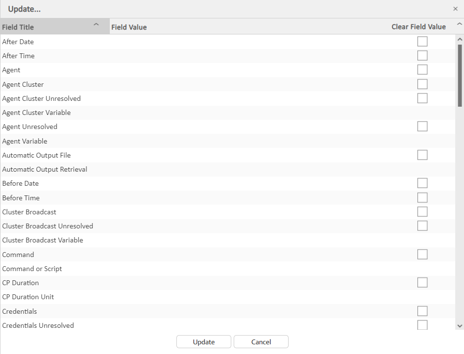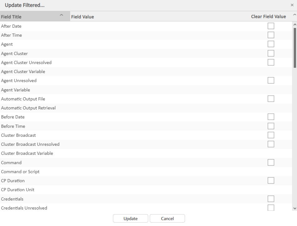 If you are updating multiple records on the All Tasks list or All Triggers list, the Update / Update Filtered dialog contains only fields that are common to all types of tasks or triggers.