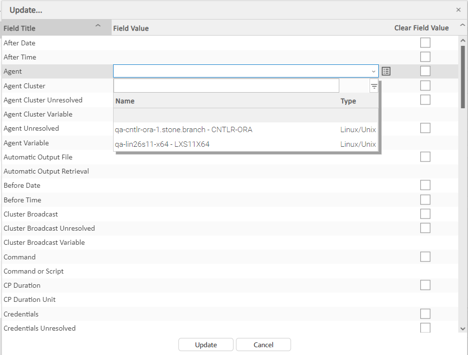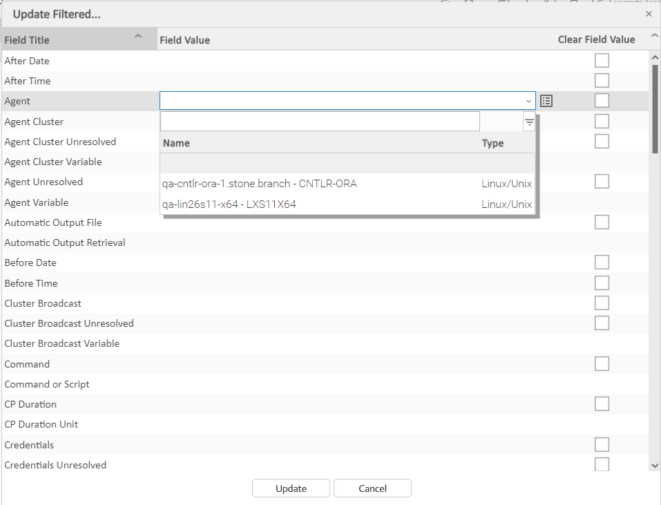 Step 6 | For any field, click anywhere in the Field Value cell to display an editor where you can enter / select a value. For example, if you click the Agent row, a drop-down list displays that lets you select any currently defined Linux/Unix Agent.