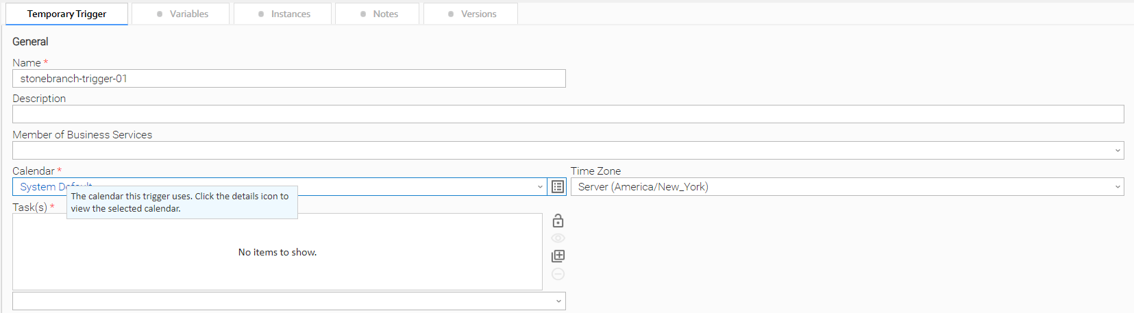 For example, every Trigger record contains a Calendar field whose value is the name of a Calendar selected from the drop-down list: