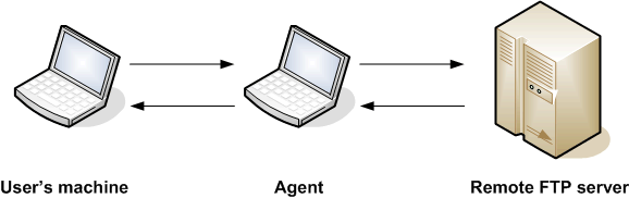 In the following example, the user wants to monitor for a file on a remote FTP Server that does not have an Agent running on it. In this case, the Remote File Monitor task definition provides an address and login credentials for the machine where the Agent is running as well as address and login credentials for the FTP server.