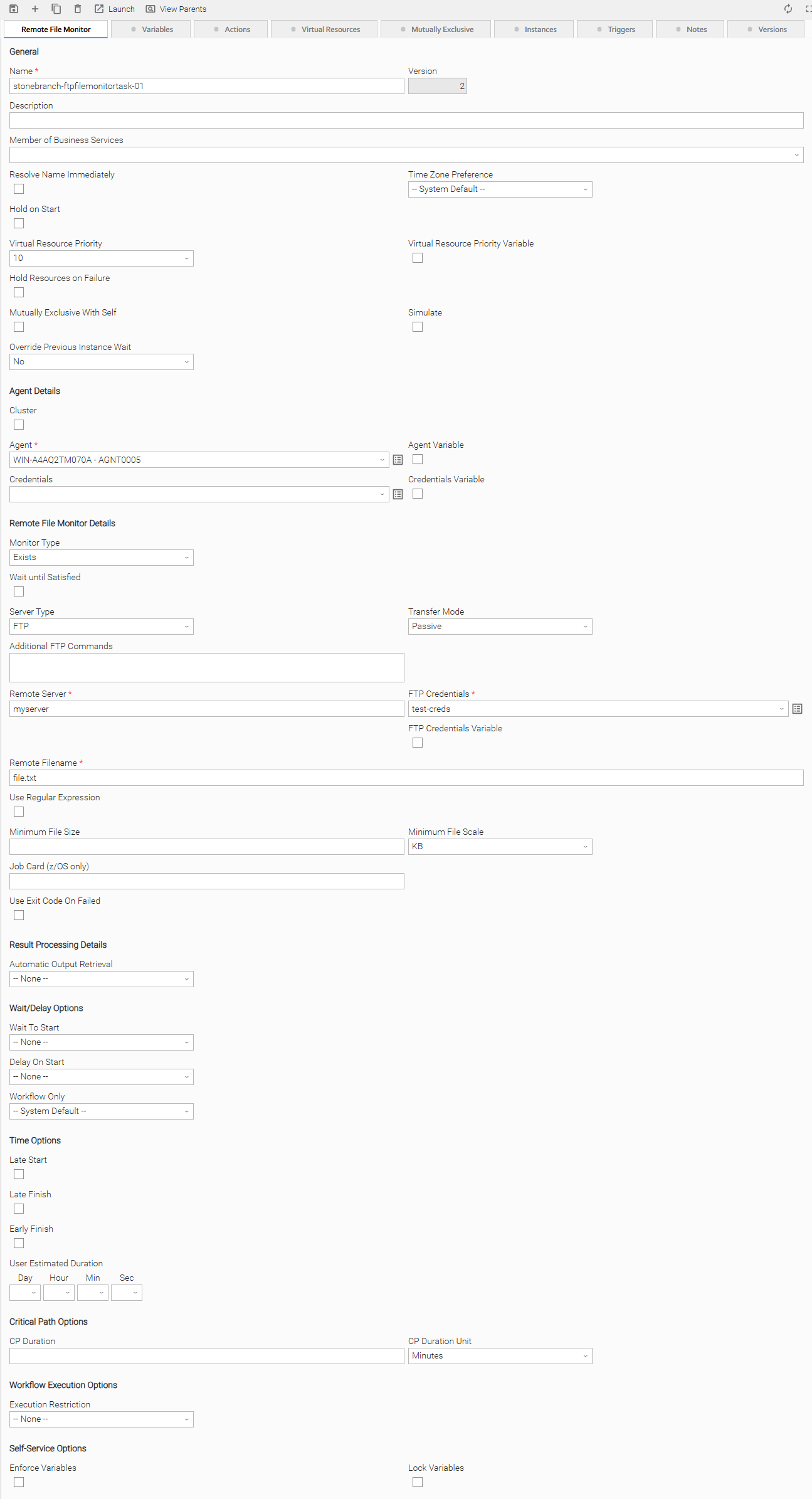 In the following example, the user wants to monitor for a file on a remote FTP Server that has an Agent running on it. In this case, the login credentials for the Agent machine and the FTP server machine are the same.