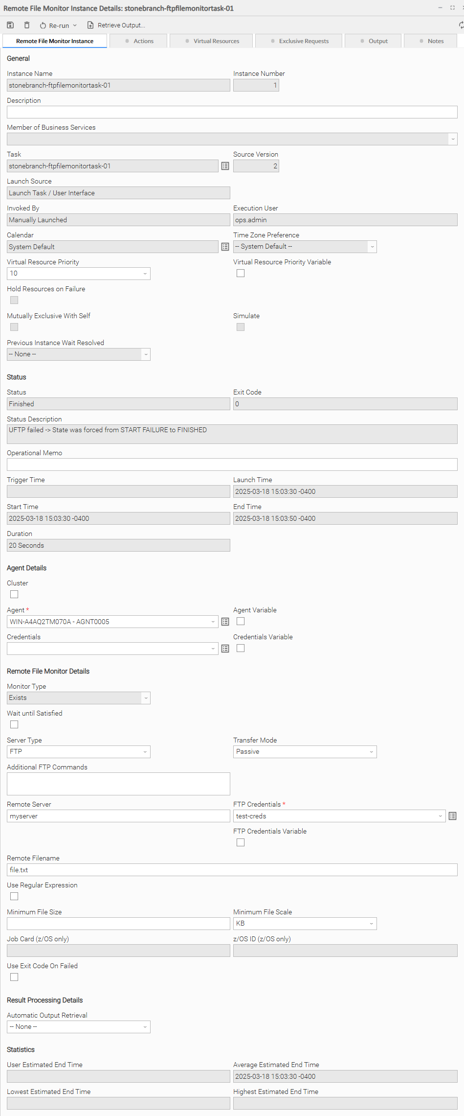 The following Remote File Monitor Task Instance Details contains information on the execution of the task shown in the Remote File Monitor Task Details.