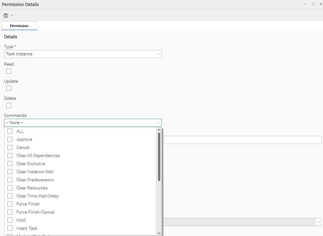 • Clear Time Wait/Delay: Grants permission to clear all Wait To Start and Delay On Start specifications for a Task Instance.