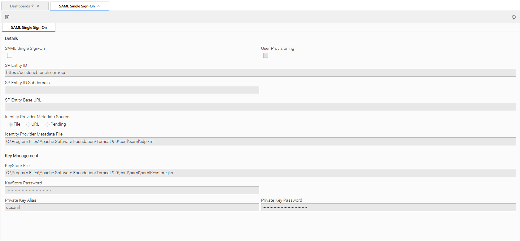 Upon initial start-up of Universal Controller, a default SAML Single Sign-On record is created and associated with the Universal Controller node by node id. The settings are specific to the Universal Controller node, as the SP Entity ID, Base URL, and File paths may differ between each Universal Controller node. See SAML Single Sign-On Field Descriptions, above, for the default configuration.