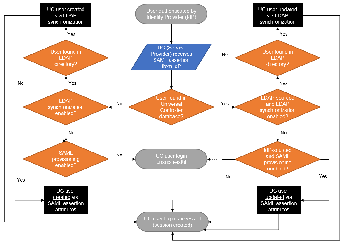 Once a user has been provisioned (created) in the Universal Controller database, its Source (ldap:dn or idp:remote-entity-id) determines how the user record is refreshed during the next login through single sign-on.